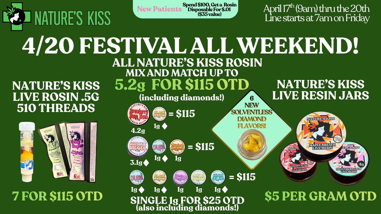We know that everyone turns to medical cannabis for their own reasons: a mood, an ailment or just a good night's sleep. That’s why we offer seed to store products grown and manufactured to our high standards. At Nature's Kiss, there is no such thing as a dumb question! We are committed to providing our patients with a superior experience in an environment that is unrushed, safe and educational. Nature's Kiss is more than a marijuana dispensary—it's a way to heal better, feel better and live better.